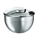 (More customer reviews)This salad spinner does the job and it is designed to look good on shelf or counter. The outer bowl and lid are made of stainless steel. What the description does not tell you is that the rotating inner basket and the mechanism under the lid that turns the basket are made of plastic. This salad spinner does not come with a warranty.